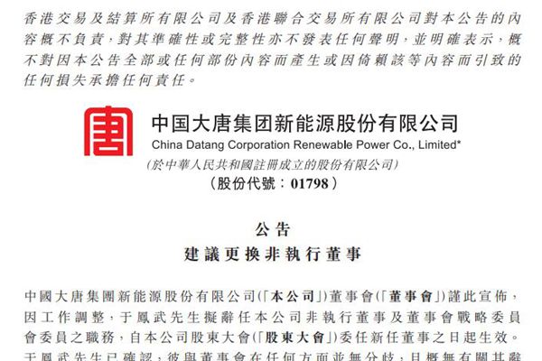 大唐新能源公布,因工作调整,于凤武先生拟辞任公司非执行董事及董事会战略委员会委员的职务,自公司股东大会委任新任董事之日起生效。 荣晓杰女士获提名为公司非执行董事候选人,自股东大会上获股东批准之日起生效。图源:大唐新能源公告 申明:本站发布此信息的目的在于传播更多信息,与本站立场无关。并且郑重提示所有阅读者,股市有风险,投资需谨慎,...
