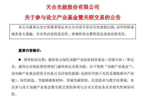 2024年10月1日,天合光能股份有限公司发布《关于参与设立产业基金暨关联交易的公告》。图源:天合光能 公告称,天合光能全资子公司诚昱投资拟与建信(北京)投资基金管理有限责任公司、芜湖建享一号创业投资基金合伙企业(有限合伙)、星元企管、国家绿色发展基金股份有限公司共同投资设立双碳产业基金。双碳产业基金规模为 16 亿元,其中公司全资...