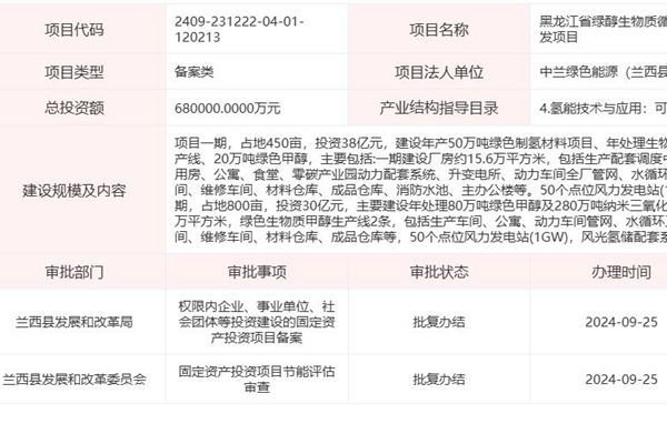 据黑龙江省投资项目在线审批监管平台消息,9月25日,黑龙江省绿醇生物质循环经济纳米新材料产业园综合配套开发项目获备案。该项目由中兰绿色能源(兰西县)有限公司建设,中兰绿色能源为中鑫国际船舶发展有限公司全资子公司。 项目一期:投资38亿元,建设年产50万吨绿色制氢材料项目、年处理生物质秸秆80万吨生物质乙醇及聚乳酸生产线、20万吨绿色...