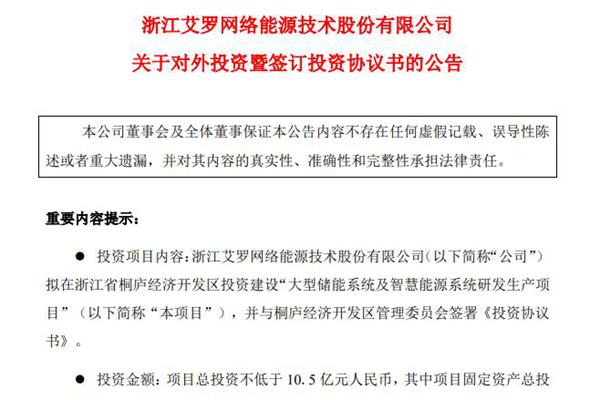 2024年9月30日, 浙江艾罗网络能源技术股份有限公司发布《关于对外投资暨签订投资协议书的公告》。图源:浙江艾罗网络能源技术股份有限公司 公告称,艾罗能源拟在浙江省桐庐经济开发区投资建设“大型储能系统及智慧能源系统研发生产项目”,并与桐庐经济开发区管理委员会签署《投资协议书》。该项目总投资不低于 10.5 ...