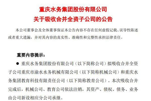 2024年10月1日,重庆水务集团股份有限公司发布《关于吸收合并全资子公司的公告》。图源:重庆水务公告 根据公告,重庆水务拟吸收合并全资子公司重庆市渝水水务机械有限公司和重庆水务集团教育科技有限责任公司。 理由:有效提升管理水平,精简层级、整合资源、高效决策、强化监管。 公告称,本次吸收合并完成后,机械公司、教育公司依法注销,其...