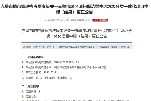 2024年8月20日,中国政府采购网发布《赤壁市城市管理执法局本级关于赤壁市城区清扫保洁暨生活垃圾分类一体化项目中标(结果)更正公告》。 1、更正中标商 原公告中标供应商:长沙中联重科环境产业有限公司,现变更为:湖北美龙新能源有限责任公司;原公告中标供应商地址:长沙高新开发区林语路288号,现变更为:武昌区东湖路10号水果湖广场B...