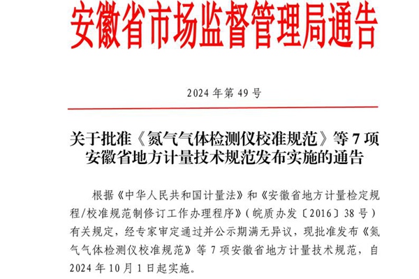 关于批准《氮气气体检测仪校准规范》等7项安徽省地方计量技术规范发布实施的通告 根据《中华人民共和国计量法》和《安徽省地方计量检定规程/校准规范制修订工作办理程序》(皖质办发[2016] 38号)有关规定,经专家审定通过并公示期满无异议,现批准发布《氮气气体检测仪校准规范》等7项安徽省地方计量技术规范,自2024年10月1日起实施。 附...