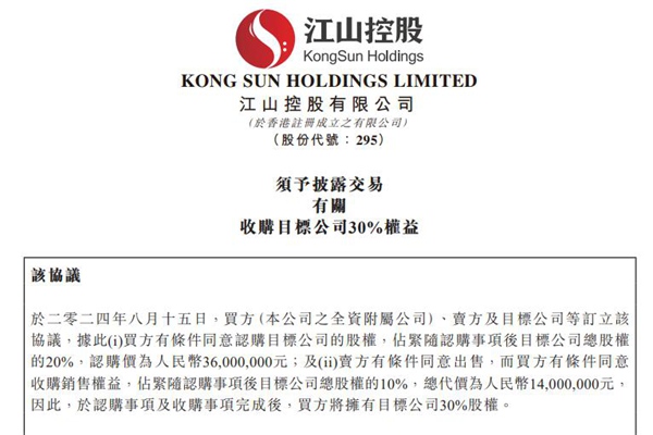 2024年8月15日,江山控股有限公司发布公告,拟收购北京思博慧医科技有限公司30%股权,总交易价格为5000万元。 公告——于二零二四年八月十五日,买方(本公司之全资附属公司)、卖方及目标公司等订立该协议,据此(i)买方有条件同意认购目标公司的股权,占紧随认购事项后目标公司总股权的20%,认购价为人民币36...