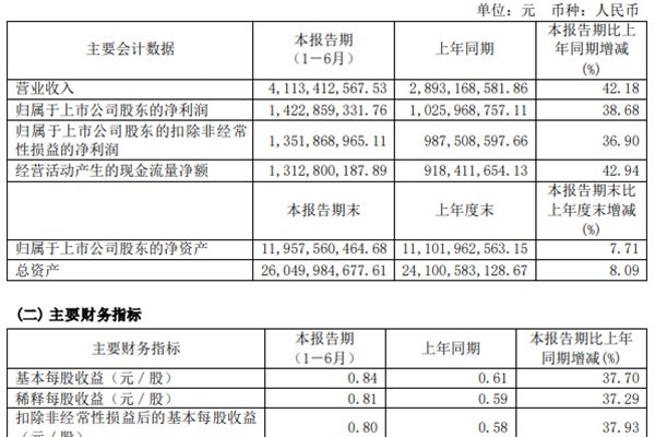 2024年8月17日,伟明环保发布《2024年半年度报告》。 报告显示,2024年上半年,伟明环保实现营业收入41.13亿元,较上年同期增长42.18%;归属于上市公司股东的净利润14.23亿元,较上年同期增长38.68%;归属于上市公司股东的扣除非经常性损益的净利润13.52亿元,较上年同期增长36.9%。 截至本报告期末,伟明...