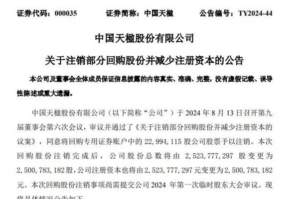 中国天楹股份有限公司(简称:中国天楹)8月14日公告称,公司召开第九届董事会第六次会议,审议并通过了《关于注销部分回购股份并减少注册资本的议案》,同意将回购专用证券账户中的 22,994,115 股公司股票予以注销。本次回购股份注销完成后,公司股份总数将由 2,523,777,297 股 变 更 为2,500,783,182股,公司注...