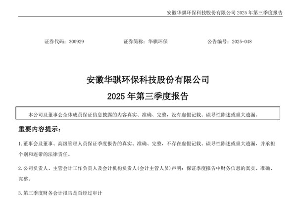 安徽华骐环保科技股份有限公司(简称:华骐环保)近日发布《2025年第三季度报告》。2025年前三季度,华骐环保实现营业收入为2.58亿元,同比增长58.86%;归母净利润为-184.31万元,同比增长84.98%;扣非归母净利润为-298.13万元,同比增长77.93%;基本每股收益-0.01元。图源:华骐环保公告 华骐环保主要业务...