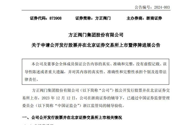 3月13日,方正阀门集团股份有限公司(简称:方正阀门)发布《关于申请公开发行股票并在北京证券交易所上市暨停牌进展公告》,拟公开发行股票并在北京证券交易所上市。 2023 年 12 月 12 日,方正阀门在浙商证券的辅导下,已通过中国证券监督管理委员会(以下简称“中国证监会”)浙江监管局的辅导验收。2024 年...