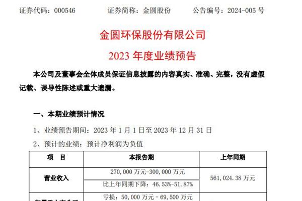 金圆环保股份有限公司(简称:金圆股份)近日发布《2023年度业绩预告》,预计2023年实现营业收入27亿元-30亿元,同比下降46.53%-51.87%;归属于上市公司股东的净利润亏损50,000万元–69,500万元,比上年同期下降137.42%–230.01%;扣除非经常性损益后的净利润亏损:60,000 ...