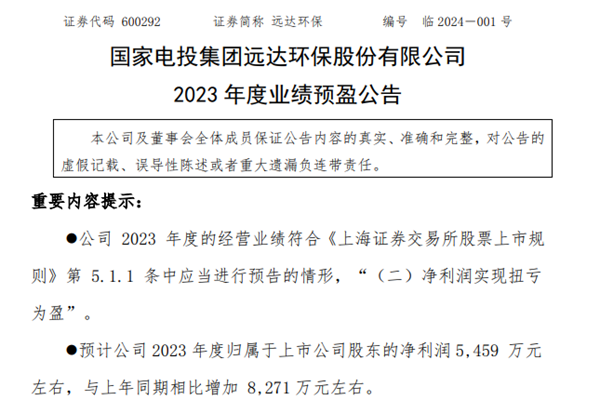 2023年1月1日至2023年12月31日,经国家电投集团远达环保股份有限公司(下称“远达环保”)财务部门初步测算,预计公司2023年度归属于上市公司股东的净利润5459万元左右,与上年同期相比增加8271万元左右。预计公司2023年度归属于上市公司股东的扣除非经常性损益的净利润约318万左右,与上年同期相比增...