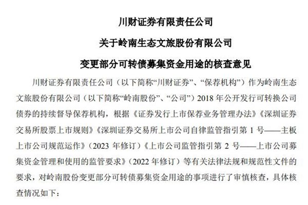 近日,岭南生态文旅股份有限公司(简称:岭南股份)发布《川财证券有限责任公司关于岭南生态文旅股份有限公司变更部分可转债募集资金用途的核查意见》。 公告提到,岭南股份在2018年公开发行可转换公司债券,扣除发行费用共计募集资金净额为64792万元,原计划用于乳山市城市绿化景观建设及提升改造 PPP 项目、邻水县御临河关门石至曹家滩及其支...
