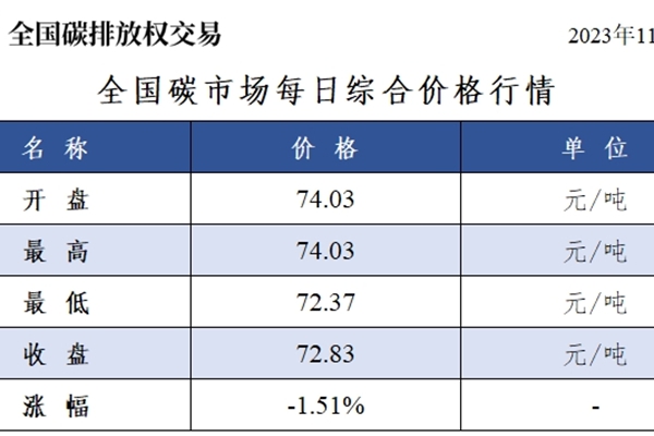 今日全国碳市场综合价格行情为: 开盘价74.03元/吨,最高价74.03元/吨,最低价72.37元/吨,收盘价72.83元/吨,收盘价较前一日下跌1.51%。 今日挂牌协议交易成交量759,476吨,成交额55,320,646.65元;大宗协议交易成交量1,958,653吨,成交额141,003,644.54元。 今日全国碳排放配...