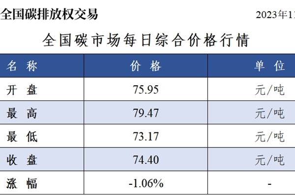 2023年11月7日全国碳市场综合价格行情为: 开盘价75.95元/吨,最高价79.47元/吨,最低价73.17元/吨,收盘价74.40元/吨,收盘价较前一日下跌1.06%。 2023年11月7日挂牌协议交易成交量340,222吨,成交额25,235,302.24元;大宗协议交易成交量1,418,681吨,成交额104,162,99...