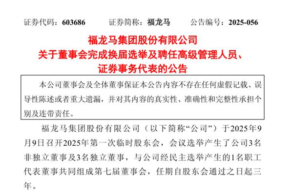 福龙马集团股份有限公司(简称:福龙马)公告称,公司于2025年9月9日召开2025年第一次临时股东会、第七届董事会第一次会议,选举产生第七届董事会、董事长、各专门委员会成员,并聘任总裁、副总裁、财务负责人、董事会秘书、证券事务代表。详情如下↓ 一、公司第七届董事会组成情况 第七届董事会共由7名董事组成,其中独立董事3名、...