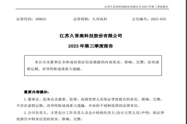 10月22日,久吾高公布《2023年第三季度报告》。报告期内,其营业收入1.46亿元,同比下降39.49%;归属于上市公司股东的净利润228.55万元,同比下降78.08%;归属于上市公司股东的扣除非经常性损益的净利润-282.38万元;基本每股收益0.0186元/股。 公开资料显示,久吾高科经过多年的持续发展,已经具有从膜材料生产...