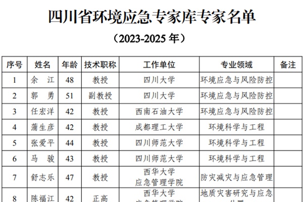 关于印发《四川省环境应急专家库专家名单(2023-2025年)》的通知 各市(州)生态环境局,各有关单位: 为进一步加强环境应急管理,充分发挥环境应急专家在突发生态环境事件应急处置和环境应急管理等工作中的决策咨询作用,根据《四川省环境应急专家库管理办法(试行)》有关规定,对省环境应急专家库进行了遴选更新。前期已完成申报、资格审查、审议、...