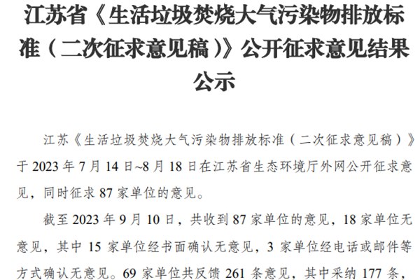 日前,被业内称为“最严垃圾焚烧排放标准”的江苏《生活垃圾焚烧大气污染物排放标准(二次征求意见稿)》于2023年7月14日——8月18日在江苏省生态环境厅外网公开征求意见,同时征求87家单位的意见。 截至2023年9月10日,共收到87家单位的意见,18家单位无意见,其中15家单位经书面...