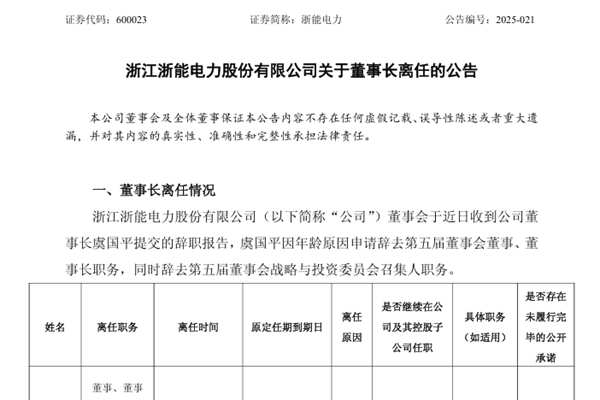 浙江浙能电力股份有限公司(简称:浙能电力)公告称,董事会于近日收到公司董事长虞国平提交的辞职报告,虞国平因年龄原因申请辞去第五届董事会董事、董事长职务,同时辞去第五届董事会战略与投资委员会召集人职务。图源:浙能电力公告 申明:本站发布此信息的目的在于传播更多行业信息,相关数据仅供参考,不构成投资建议。环保在线力求但不保证数据的完全准...