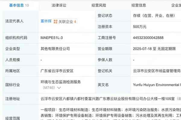 近日,云浮市惠云环保科技有限公司成立,注册资本500万元,法定代表人为董林辉,经营范围包含:生态环境材料制造;生态环境材料销售;水环境污染防治服务;水质污染物监测及检测仪器仪表制造等。图源:企查查 股权穿透显示,该公司由广东惠云钛业股份有限公司、深圳市丰川净水技术有限公司共同持股。...