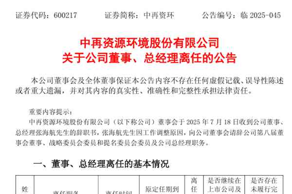 中再资源环境股份有限公司(简称:中再资环)近日公告称,公司已收到董事、总经理张海航先生的辞职书,张海航先生因工作调整原因,向公司董事会请辞公司第八届董事会董事、战略委员会委员和提名委员会委员及公司总经理职务。图源:中再资环公告 鉴于张海航先生已辞任公司总经理职务,经公司董事长邢宏伟先生提议,在公司董事会聘任新的公司总经理前,由公司副...