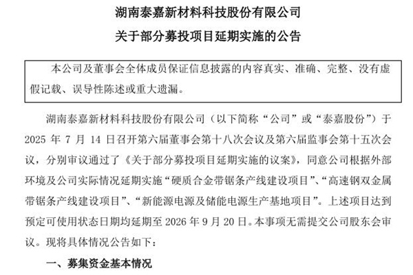 2025年07月16日,湖南泰嘉新材料科技股份有限公司发布《关于部分募投项目延期实施的公告》。图源:泰嘉股份公告 泰嘉股份 “ 硬质合金带锯条产线建设项目”、 “高速钢双金属带锯条产线建设项目”、“新能源电源及储能电源生产基地项目”延期实施。 公司&ldquo...