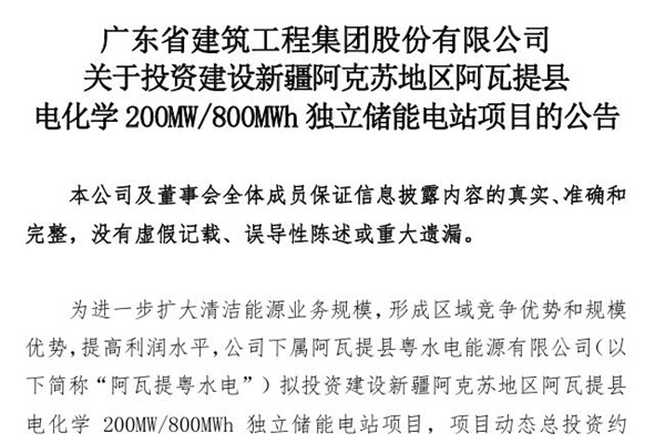 2025年07月15日,广东省建筑工程集团股份有限公司发布《关于投资建设新疆阿克苏地区阿瓦提县电化学200MW/800MWh独立储能电站项目的公告》。图源:广东建工公告 为进一步扩大清洁能源业务规模,形成区域竞争优势和规模优势,提高利润水平,公司下属阿瓦提县粤水电能源有限公司拟投资建设新疆阿克苏地区阿瓦提县电化学 200MW/800...