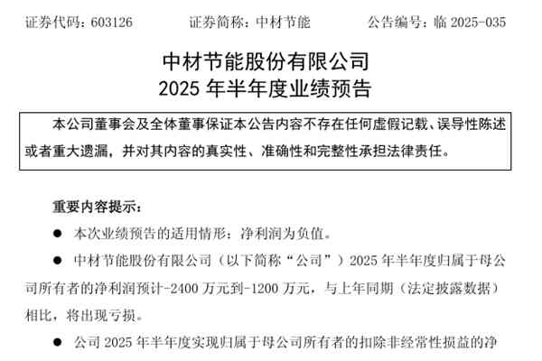中材节能股份有限公司(简称:中材节能)近日发布《2025年半年度业绩预告》。报告期内,中材节能预计实现归属于母公司所有者的净利润-2400万元到-1200万元,与上年同期(法定披露数据)相比,将出现亏损;归属于母公司所有者的扣除非经常性损益的净利润为-2900万元到-1600万元。 中材节能表示,2025 年受行业竞争加剧影响,业务...