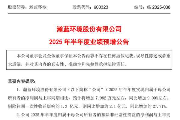 瀚蓝环境股份有限公司(简称:瀚蓝环境)近日发布《2025年半年度业绩预增公告》。报告期内,瀚蓝环境预计实现归属于母公司所有者的净利润与上年同期相比,预计将增加7,982万元左右,同比增加9.00%左右。剔除往期一次性收益影响约1.3 亿元,则同比增加约2.1亿元,同比增加约27.71%。 瀚蓝环境表示,在去年同期含一次性往期收益约1...