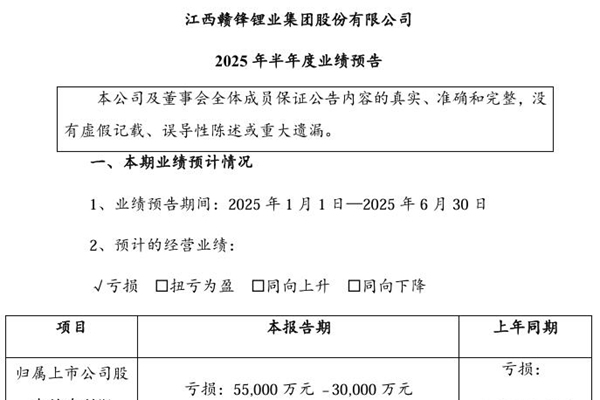 2025年07月15日,江西赣锋锂业集团股份有限公司发布《2025 年半年度业绩预告》。图源:赣锋锂业公告 归属上市公司股东的净利润预计亏损55,000万元 – 30,000万元。 1、本报告期内,锂盐及锂电池产品销售价格持续下跌,虽公司电池板块的产能有序释放、销售增长,但公司整体经营业绩遭受一定冲击。此外,公司根据会...