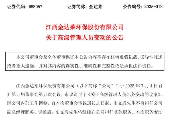 江西金达莱环保股份有限公司(简称:金达莱)近日公告称,因公司内部工作调整,史文彦先生不再担任公司副总经理职务。调整后,史文彦先生将继续在公司担任其他职务。本次职务变动不会对公司日常经营产生不利影响。图源:金达莱公告 据悉,金达莱是一家专注于环保领域的企业,主营业务包括水污染治理、固废处理等环保工程的设计、建设和运营,其产品广泛应用于...