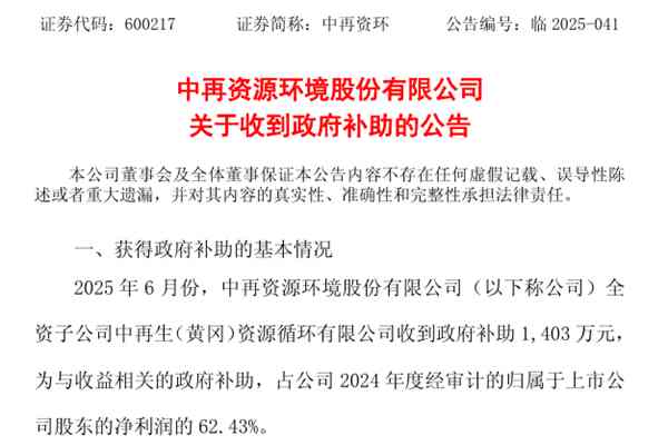 中再资源环境股份有限公司(简称:中再资环)近日公告称,2025年6月份,其子公司中再生(黄冈)资源循环有限公司收到政府补助1,403万元,为与收益相关的政府补助,占公司2024年度经审计的归属于上市公司股东的净利润的62.43%。 公开资料显示,中再生(黄冈)资源循环有限公司成立于2019年,注册资本1000万元,主要从事资源再生利...