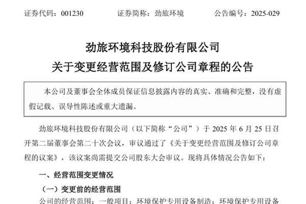 劲旅环境科技股份有限公司(简称:劲旅环境)近日公告称,公司经营范围将新增“智能机器人的研发;智能机器人销售;工业机器人制造;工业机器人安装、维修;建筑废弃物再生技术研发;病媒生物防制服务;林业有害生物防治服务;城乡市容管理;城市绿化管理;农林牧渔业废弃物综合利用;农业园艺服务;资源循环利用服务技术咨询;大数据服务;软件销售...