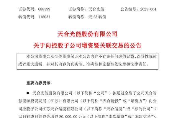天合光能股份有限公司(简称:天合光能)近日公告称,根据公司发展战略规划,为增强资金实力、促进公司储能业务发展,公司拟通过全资子公司天合智慧能源投资发展(江苏)有限公司(下称“天合能投”)向公司控股子公司江苏天合储能有限公司(下称“天合储能”)以自有或自筹资金增资80,000.00万元。天...
