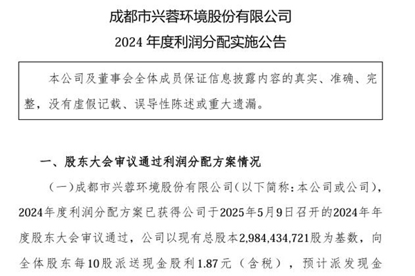 2025年06月11日,成都市兴蓉环境股份有限公司发布《2024 年度利润分配实施公告》。图源:兴蓉环境公告 公司以现有总股本2,984,434,721股为基数,向全体股东每10股派送现金股利1.87元(含税),预计派发现金558,089,292.83元(含税)。 本次分红派息的股权登记日为:2025年6月18日; 除权除息日为...