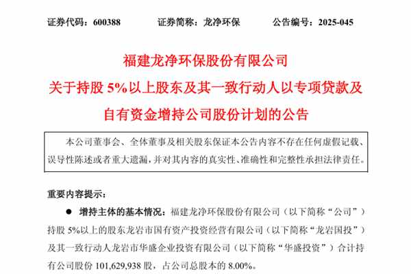 福建龙净环保股份有限公司(简称:龙净环保)近日公告称,公司收到了股东龙岩市国有资产投资经营有限公司(下称“龙岩国投”)的告知函,龙岩国投及其一致行动人拟自本公告披露之日起12个月内通过上海证券交易所交易系统以集中竞价交易方式增持公司A股股份,增持总金额不低于人民币1.175亿元,不超过人民币2.35亿元,资金来...