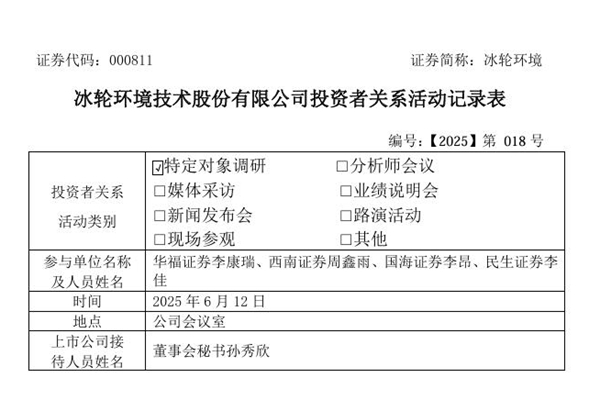 2025年06月12日,冰轮环境技术股份有限公司发布《投资者关系活动记录表》。图源:冰轮环境公告 一、讨论了公司业务情况和产业板块 公司的主要产品为压缩机和换热装置,从事“降温”“提温”“增压”功能,具体有螺杆式压缩机、离心式压缩机、吸收式压缩机、活塞式压缩...