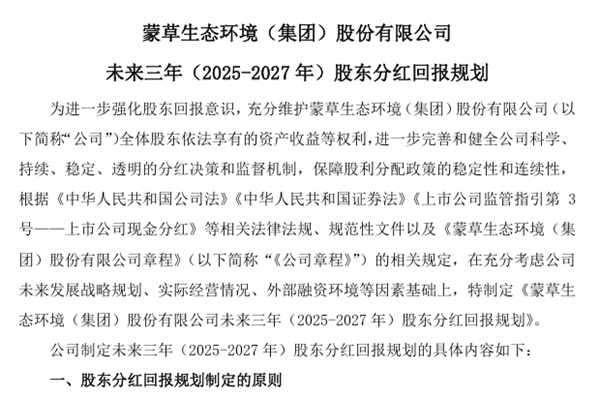 蒙草生态环境(集团)股份有限公司(简称:蒙草生态)近日披露《未来三年(2025-2027年)股东分红回报规划》,详情如下↓ (一)公司利润分配形式 公司采取现金、股票、现金股票相结合及其他合法方式分配股利,利润分配不得超过累计可分配利润的范围,不得损害公司持续经营能力。如具备现金分红条件的,应当采取现金分红进行利润分配。...