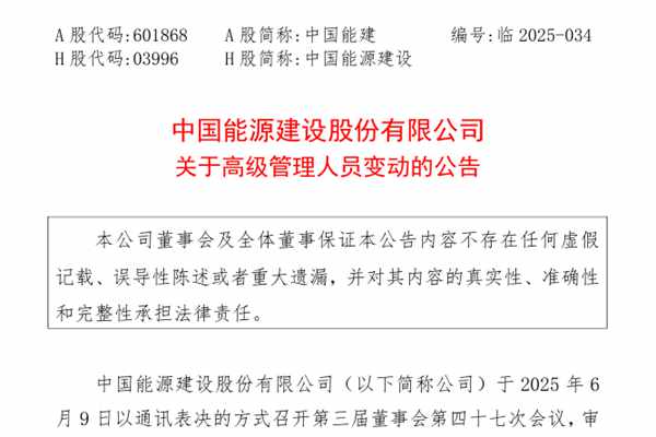 6月9日,中国能源建设股份有限公司(简称:中国能建)召开董事会,审议通过了《关于调整公司高级管理人员的议案》。因工作变动原因,李丽娜辞任中国能建总会计师职务。 经中国能建第三届董事会提名委员会第十次会议审核和第三届董事会第四十七次会议审议通过,同意聘任尹强先生、徐陆先生为公司副总经理,任期自本次董事会批准之日起至公司第三届董事会任期...