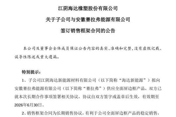 2025年06月10日,江阴海达橡塑股份有限公司发布《关于子公司与安徽赛拉弗能源有限公司签订销售框架合同的公告》。图源:海达股份公告 2025年6月9日,海达新能源与赛拉弗签署了《采购框架合同》,海达新能源按照协议约定向赛拉弗供应全面屏边框产品,赛拉弗预计采购总量为3.7GW。 赛拉弗是一家在中国注册的光伏组件制造企业,主要从事太...