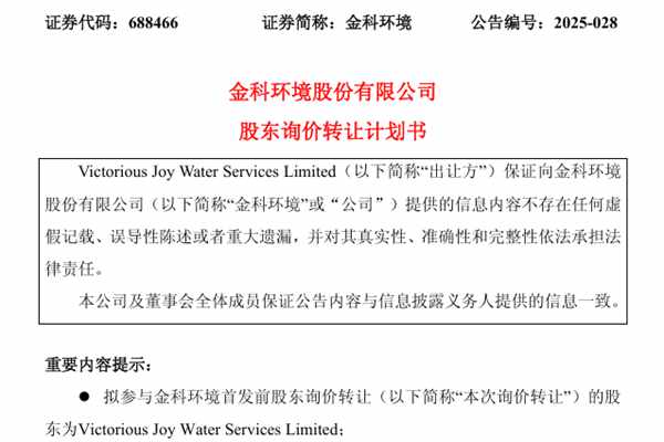 金科环境股份有限公司(简称:金科环境)公告称,控股股东Victorious Joy Water Services Limited 拟转让公司股份6,143,639股,占总股本的比例为4.99%,转让原因为自身资金需求。出让方委托中信证券股份有限公司组织实施本次询价转让。 金科环境提示,本次询价转让不通过集中竞价交易或大宗交易方式进行...