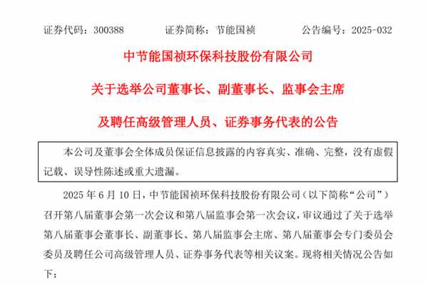中节能国祯环保科技股份有限公司(简称:节能国祯)公告称,6月10日公司召开了第八届董事会第一次会议和第八届监事会第一次会议,审议通过了关于选举第八届董事会董事长、副董事长、第八届监事会主席、第八届董事会专门委员会委员及聘任公司高级管理人员、证券事务代表等相关议案。相关情况如下: 一、公司第八届董事会及专门委员会委员组成情况 1.董...