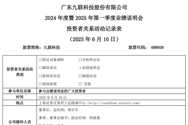 2025年06月10日, 广东九联科技股份有限公司发布《2024 年度暨 2025 年第一季度业绩说明会投资者关系活动记录表》。 九联科技表示,在智能制造方面,公司目前有激光雷达、扫地机器人、电动工具、储能PACK电池、高速双模通信单元等新产品的资源投入。未来公司将以技术储备为依托,以研究创新为根本在七个方向持续投入,其中包括新能源...