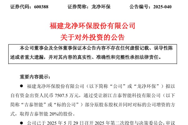 福建龙净环保股份有限公司(简称:龙净环保)近日公告称,公司拟以自有资金出资人民币7507.5万元,通过受让浙江吉泰智能科技有限公司(以下简称“吉泰智能”)部分原股东股权并同时对标的公司增资的方式,取得吉泰智能20%的股份。 据悉,吉泰智能的主要产品是应用于能源环保领域的爬壁检测清灰及缺陷诊断修复,目前收入占比...