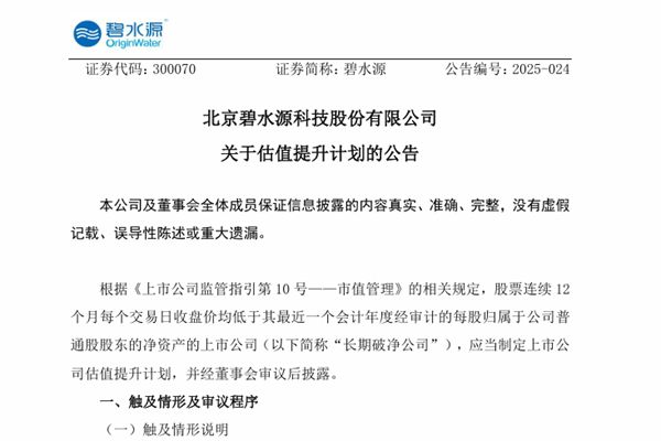 北京碧水源科技股份有限公司(简称:碧水源)近日公告称,自2024年1月1日至2024年12月31日,公司连续12个月每个交易日的收盘价均低于公司当日已披露的最近一个会计年度经审计的每股净资产。其中2024年1月1日至2024年4月3日公司股票收盘价低于2022年经审计每股净资产7.39元/股,2024年4月4日至2024年12月31日...