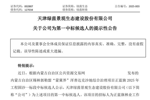 天津绿茵景观生态建设股份有限公司(简称:绿茵生态)4月2日公告称,公司已成为内蒙古自治区锡林郭勒盟“蒙冀界”浑善达克沙地综合治理项目正蓝旗2025年工程固沙一标段的中标候选人,投标报价74,756,313.55元(具体以合同签订金额为准)。该项目的招标人为正蓝旗林业工作站,招标代理机构为内蒙古品铭招标代理有限公...