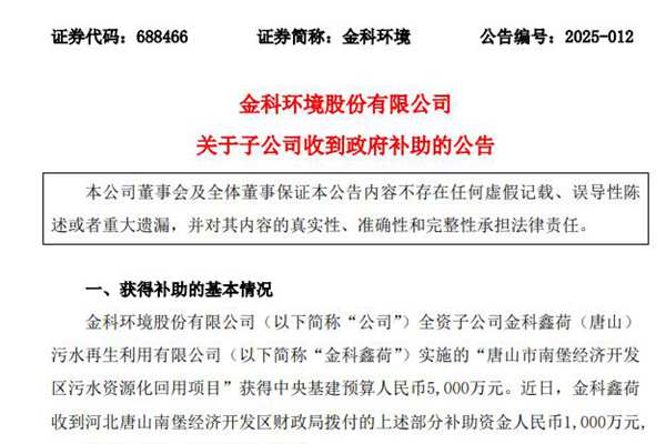 金科环境股份有限公司(简称:金科环境)近日公告称,公司全资子公司金科鑫荷(唐山)污水再生利用有限公司实施的“唐山市南堡经济开发区污水资源化回用项目”获得中央基建预算人民币5,000万元。近日,金科鑫荷收到河北唐山南堡经济开发区财政局拨付的上述部分补助资金人民币1,000万元,该笔补助为与资产相关的政府补助。图源...