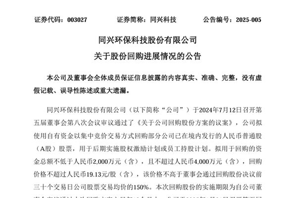 同兴环保科技股份有限公司(简称:同兴科技)近日发布《关于股份回购进展情况的公告》。公告显示,截至2025年2月28日,同兴科技通过股份回购专用证券账户以集中竞价方式回购公司股份2,161,300股,占公司当前总股本的1.65%,最高成交价为15.30元/股,最低成交价为11.72元/股,成交总金额为27,942,632.00元(不含交...