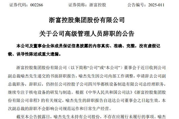 浙富控股集团股份有限公司(简称:浙富控股)近日公告称,公司董事会于近日收到副总裁喻杰先生递交的书面辞职报告,喻杰先生因公司内部工作调整,申请辞去公司副总裁职务,辞职后,仍担任公司控股子公司四川华都核设备制造有限公司总经理职务,继续专注于核电设备的研发与制造。 据悉,浙富控股的主营业务涵盖危废无害化处理及再生资源回收利用、...