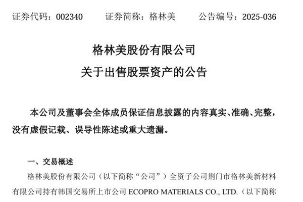 3月1日,格林美股份有限公司(简称:格林美)公告称,公司拟通过韩国交易所允许的交易方式,出售全资子公司持有的ECOPRO MATERIALS(简称ECOPRO MAT)不超过202.2074万股股票,占其总股本的3%。 资料显示,ECOPRO MAT是韩国锂电材料龙头ECOPRO CO的下属控股子公司,主营锂电池用正极材料前驱体的生...