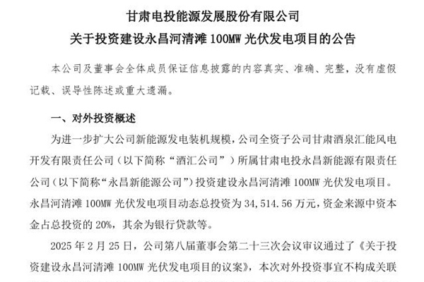 2025年02月26日,甘肃电投能源发展股份有限公司发布《关于投资建设永昌河清滩 100MW 光伏发电项目的公告》。图源:甘肃能源公告 为进一步扩大公司新能源发电装机规模,公司全资子公司甘肃酒泉汇能风电开发有限责任公司所属甘肃电投永昌新能源有限责任公司投资建设永昌河清滩100MW光伏发电项目。永昌河清滩100MW光伏发电项目动态总投...